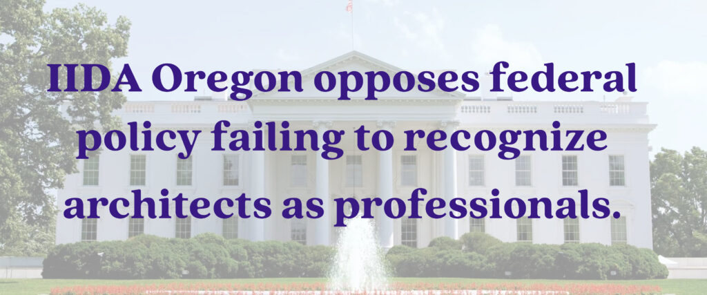 IIDA Oregon stands in solidarity with The American Institute of Architects (AIA) and numerous other national professional organizations in urging the Department of Education to correct this misclassification and ensure that all design, health, and human services professions are accurately recognized in federal policy. Now is the moment to stand together and ensure equitable access to education, licensure, and opportunity for the next generation of design leaders!