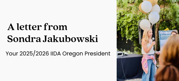 Hello, And welcome to a RADIANT new board year for IIDA! I’m Sondra Jakubowski, your new IIDA Oregon Chapter President for 2025–2026 (and sometimes cruise director for this ship!). I’m excited to help usher this team into a new year with the goal of supporting our incredible community in building great content, events, and programs…